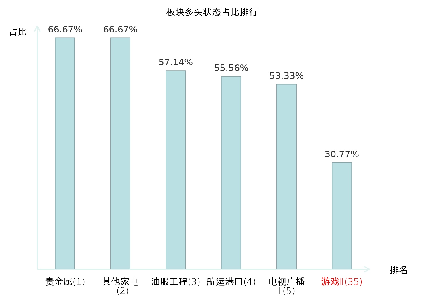 全市场所有行业板块中主力多头状态占比排名中,贵金属板块位居第一。医疗服务板块名次提升最快,较昨日上升68位。