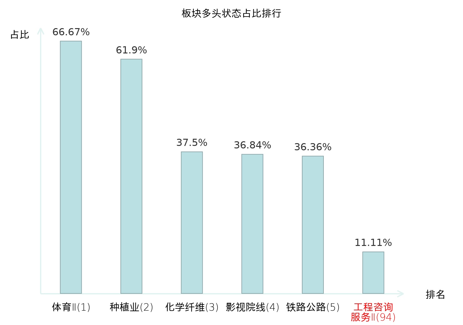 全市场所有行业板块中主力多头状态占比排名中,体育Ⅱ板块位居第一。种植业板块名次提升最快,较昨日上升65位。