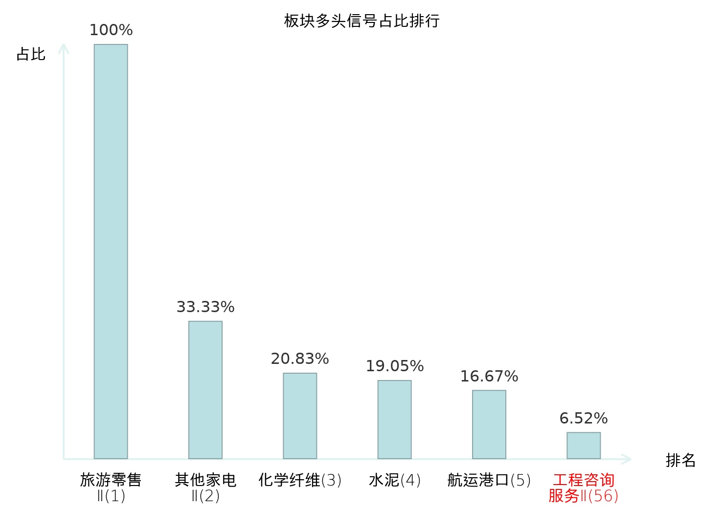 全市场所有行业板块中主力多头信号占比排名中,旅游零售Ⅱ板块位居第一。旅游零售Ⅱ板块名次提升最快,较昨日上升130位。