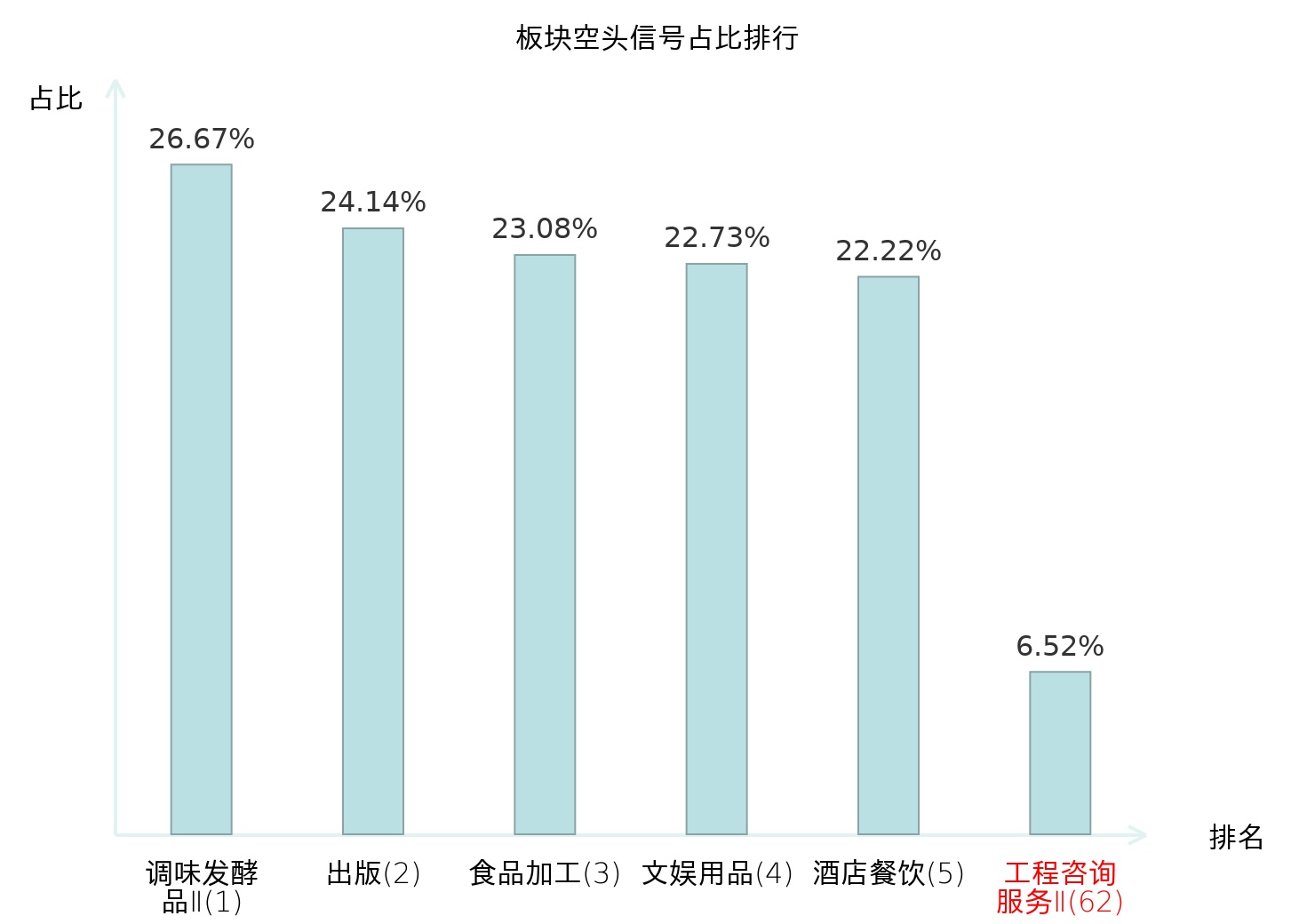 全市场所有行业板块中主力空头信号占比排名中,调味发酵品Ⅱ板块位居第一。中药Ⅱ板块名次提升最快,较昨日上升110位。