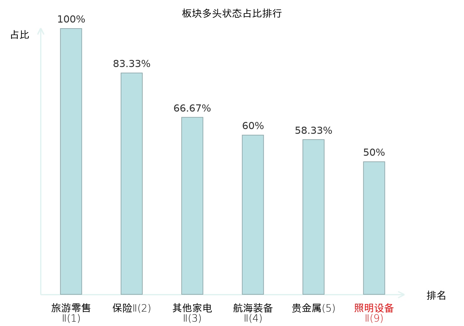 全市场所有行业板块中主力多头状态占比排名中,旅游零售Ⅱ板块位居第一。综合Ⅱ板块名次提升最快,较昨日上升69位。
