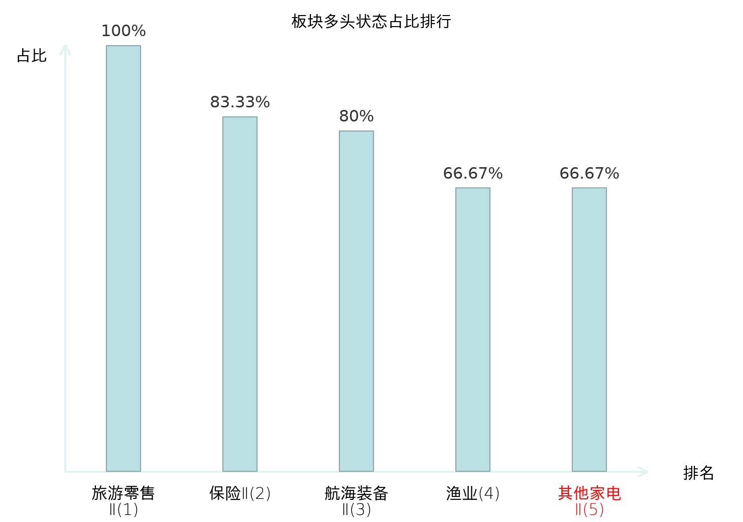 全市场所有行业板块中主力多头状态占比排名中,旅游零售Ⅱ板块位居第一。证券Ⅱ板块名次提升最快,较昨日上升106位。