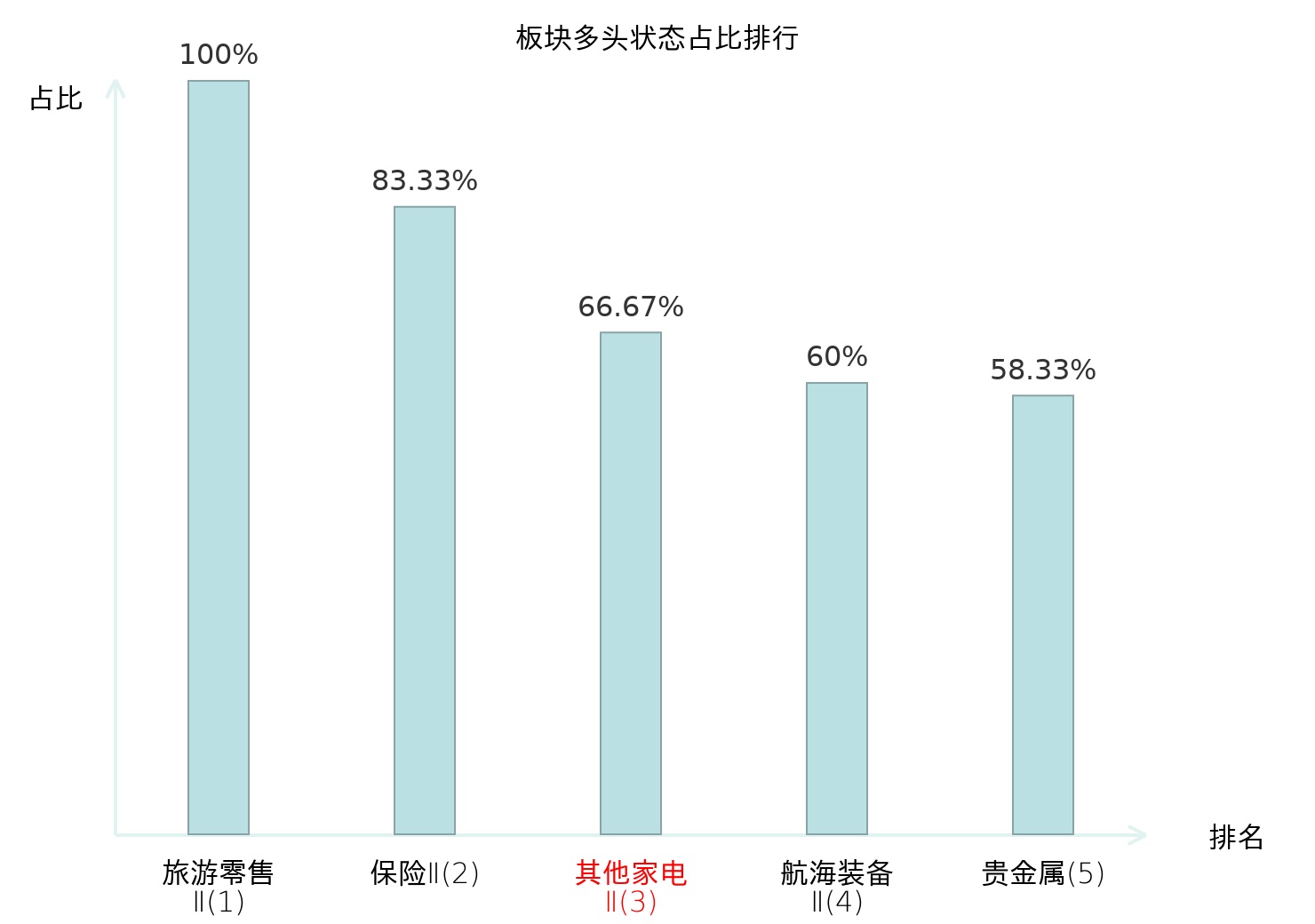 全市场所有行业板块中主力多头状态占比排名中,旅游零售Ⅱ板块位居第一。综合Ⅱ板块名次提升最快,较昨日上升69位。