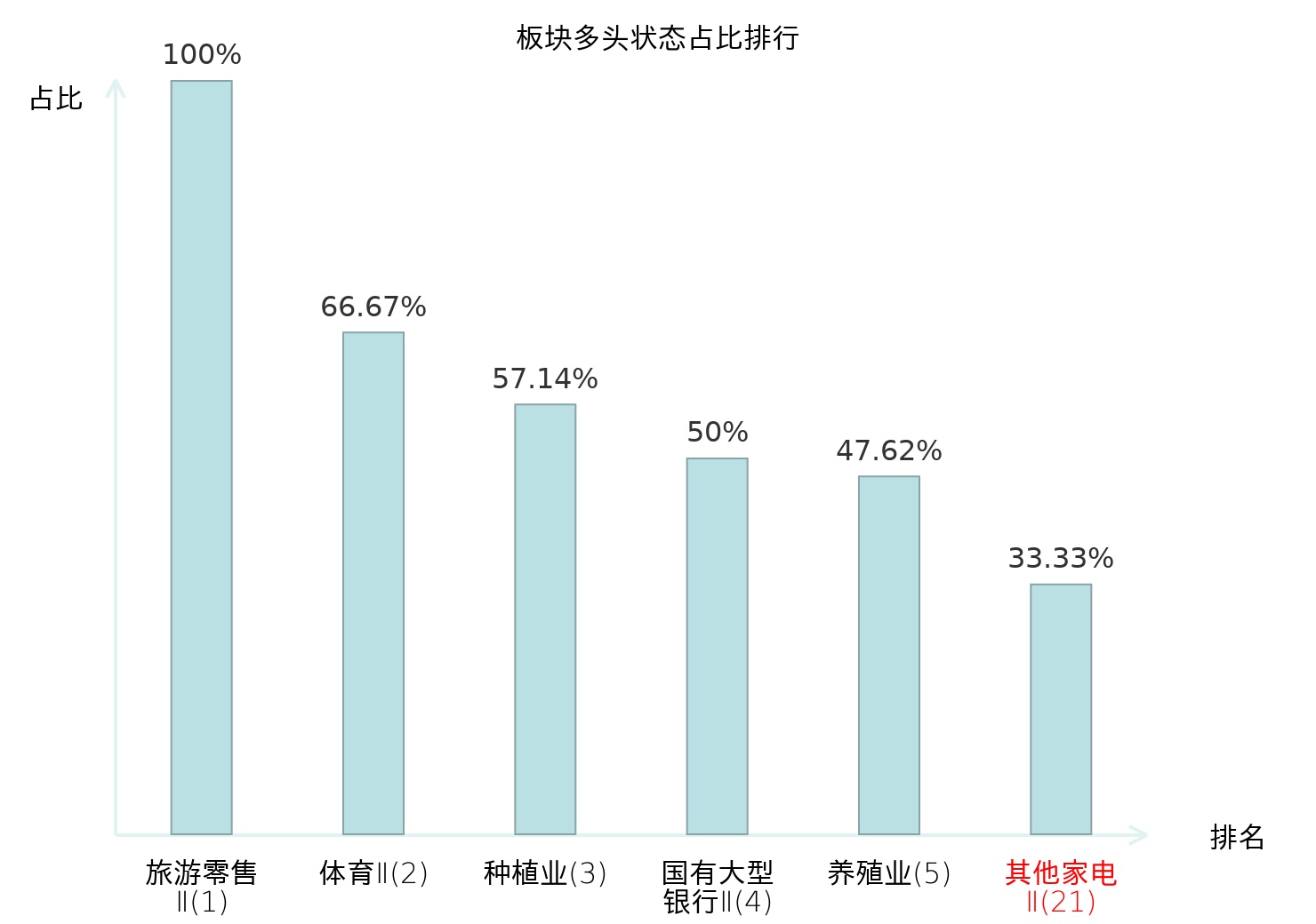 全市场所有行业板块中主力多头状态占比排名中,旅游零售Ⅱ板块位居第一。互联网电商板块名次提升最快,较昨日上升89位。