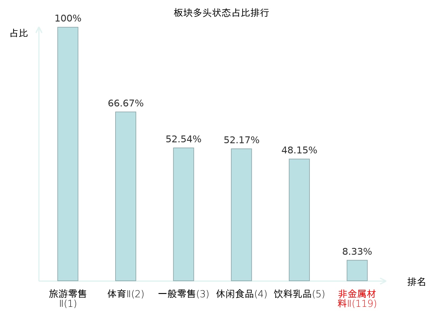 全市场所有行业板块中主力多头状态占比排名中,旅游零售Ⅱ板块位居第一。农业综合Ⅱ板块名次提升最快,较昨日上升109位。