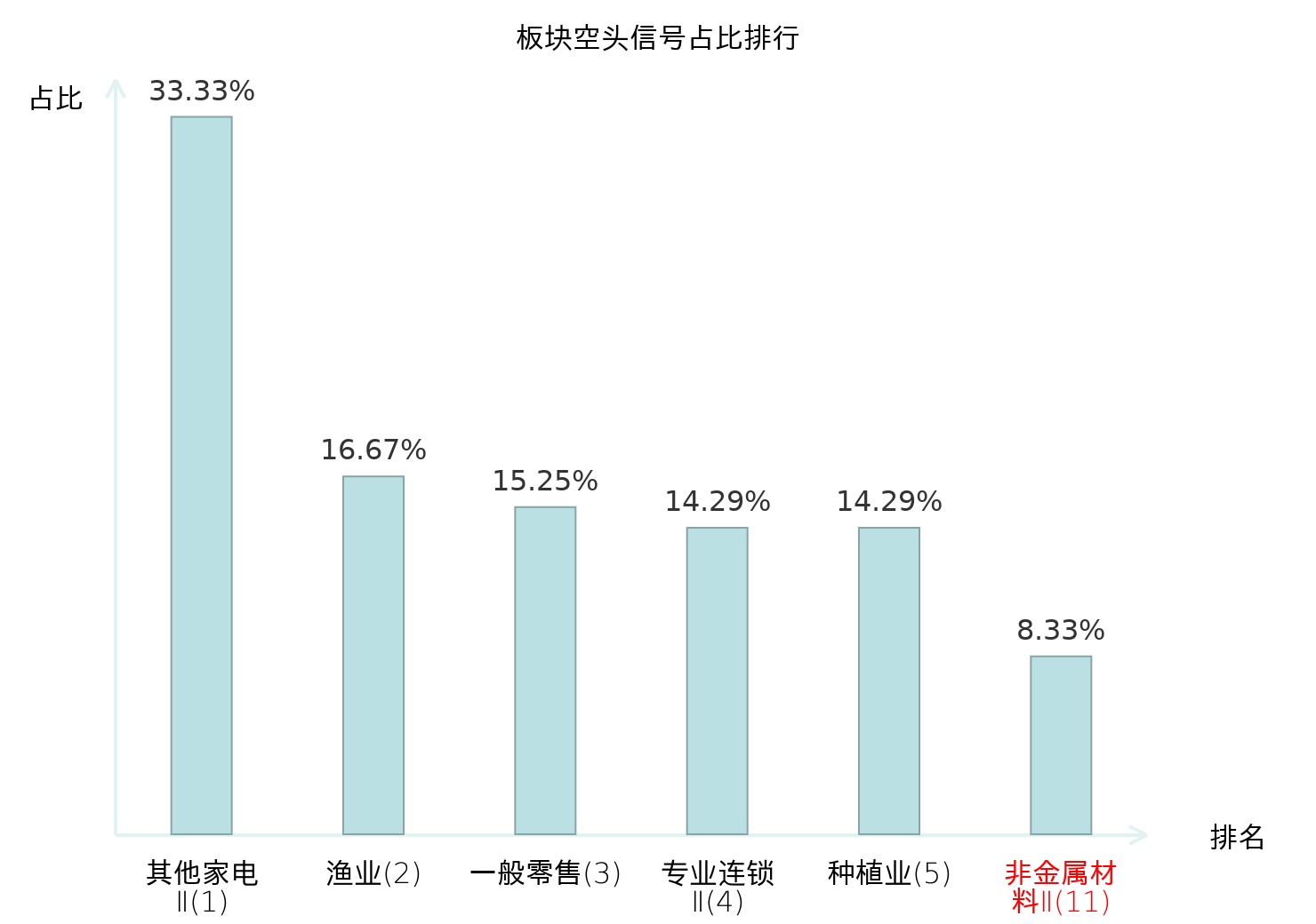 全市场所有行业板块中主力空头信号占比排名中,其他家电Ⅱ板块位居第一。造纸板块名次提升最快,较昨日上升115位。