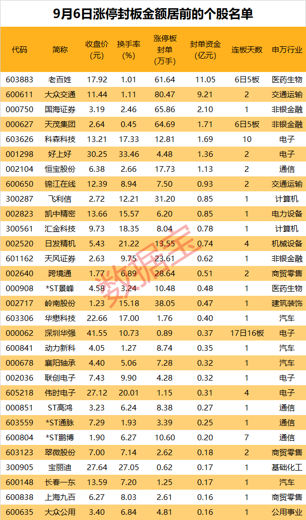 以封单金额计算,7股封单金额超1亿元,其中老百姓、大众交通、国海证券封单金额居前,分别为11.05亿元、9.21亿元、2.1亿元。