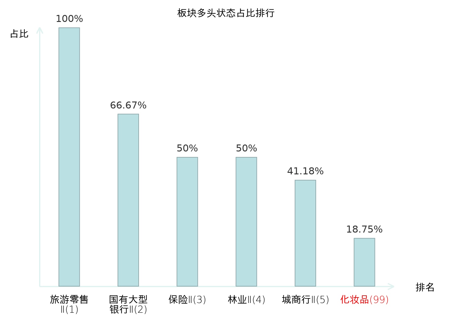全市场所有行业板块中主力多头状态占比排名中,旅游零售Ⅱ板块位居第一。林业Ⅱ板块名次提升最快,较昨日上升87位。