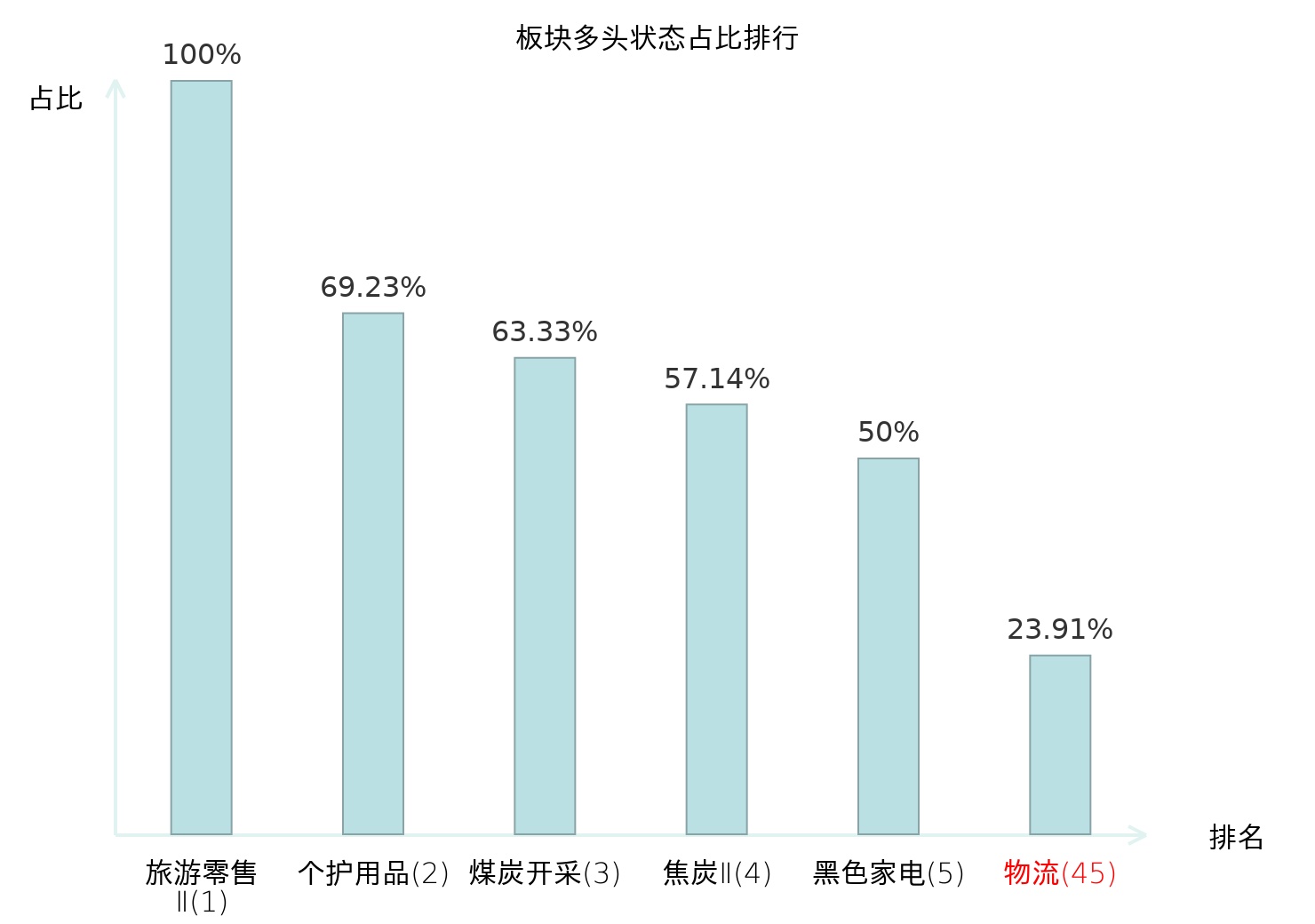 全市场所有行业板块中主力多头状态占比排名中,旅游零售Ⅱ板块位居第一。医药商业板块名次提升最快,较昨日上升67位。