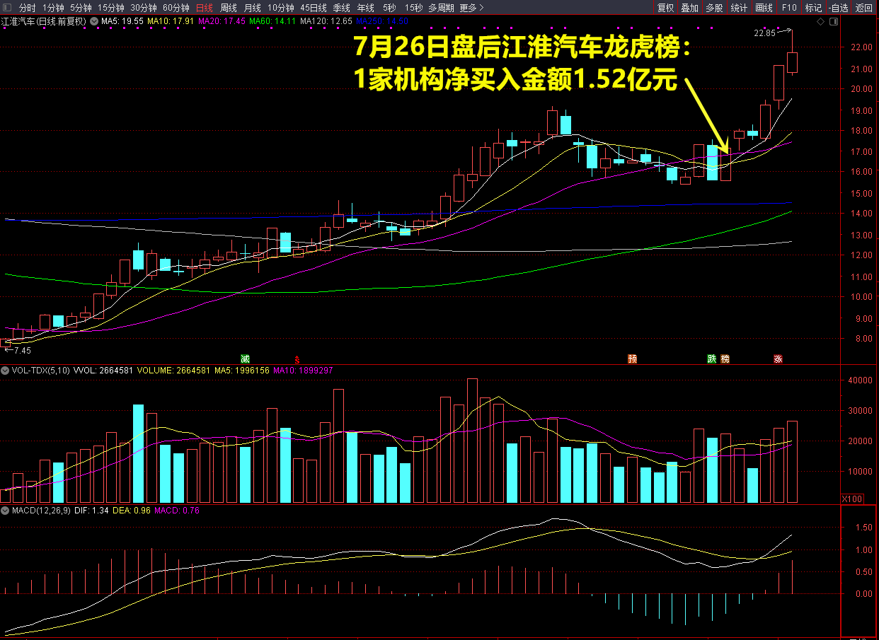 2022年7月26日收盘后,江淮汽车当日龙虎榜数据:
