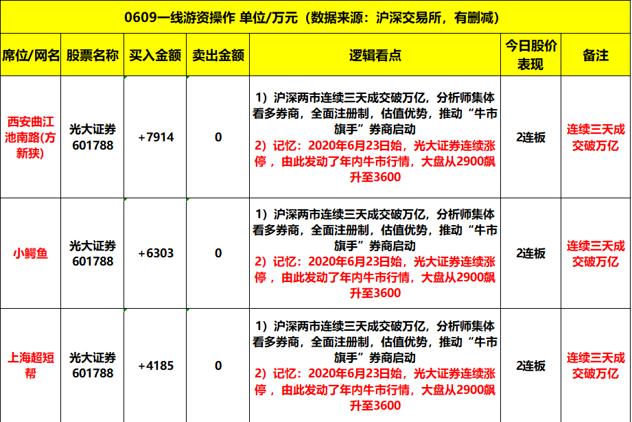 方新侠、小鳄鱼都是顶级游资,而且还是善庄,他们二位合力买入光大证券,当时市场还对券商没一点认知,直到再拉出几个涨停后,市场才发现原来总龙头在这里。从二位游资合力买入后的5个交易日,几乎又走出了接近5个板!