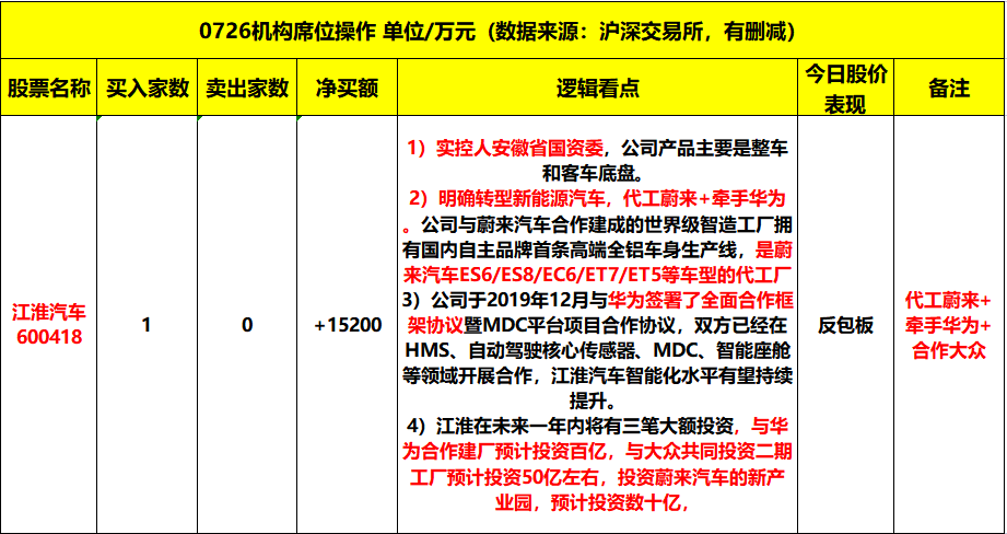 江淮汽车当日机构净买1.52亿元,机构敢这么大笔吃货,肯定是看上了它的某个基本面:代工蔚来+牵手华为+合作大众。