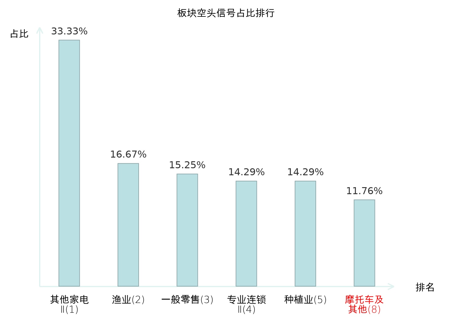 全市场所有行业板块中主力空头信号占比排名中,其他家电Ⅱ板块位居第一。造纸板块名次提升最快,较昨日上升115位。