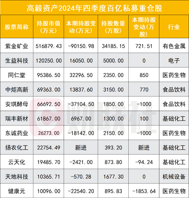 以高毅资产为例,高毅资产旗下产品2024年四季度重仓持有11只个股,合计持股市值达101.94亿元,其中,新进为扬农化工前十大流通股东名单,增持同仁堂、中炬高新、紫金矿业、瑞丰新材,同时减持了云天化、安琪酵母、东诚药业和健康元。