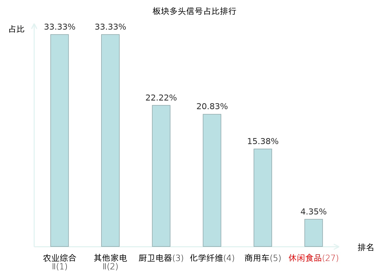 全市场所有行业板块中主力多头信号占比排名中,农业综合Ⅱ板块位居第一。其他家电Ⅱ板块名次提升最快,较昨日上升128位。