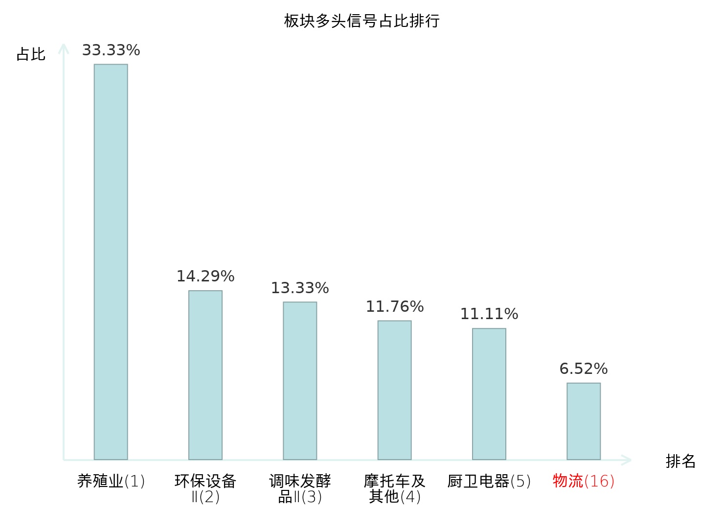 全市场所有行业板块中主力多头信号占比排名中,养殖业板块位居第一。厨卫电器板块名次提升最快,较昨日上升109位。
