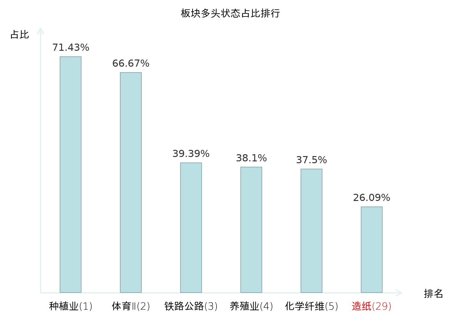 全市场所有行业板块中主力多头状态占比排名中,种植业板块位居第一。养殖业板块名次提升最快,较昨日上升99位。