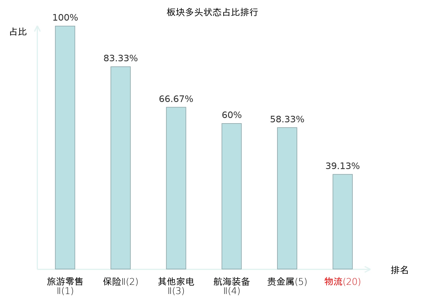 全市场所有行业板块中主力多头状态占比排名中,旅游零售Ⅱ板块位居第一。综合Ⅱ板块名次提升最快,较昨日上升69位。