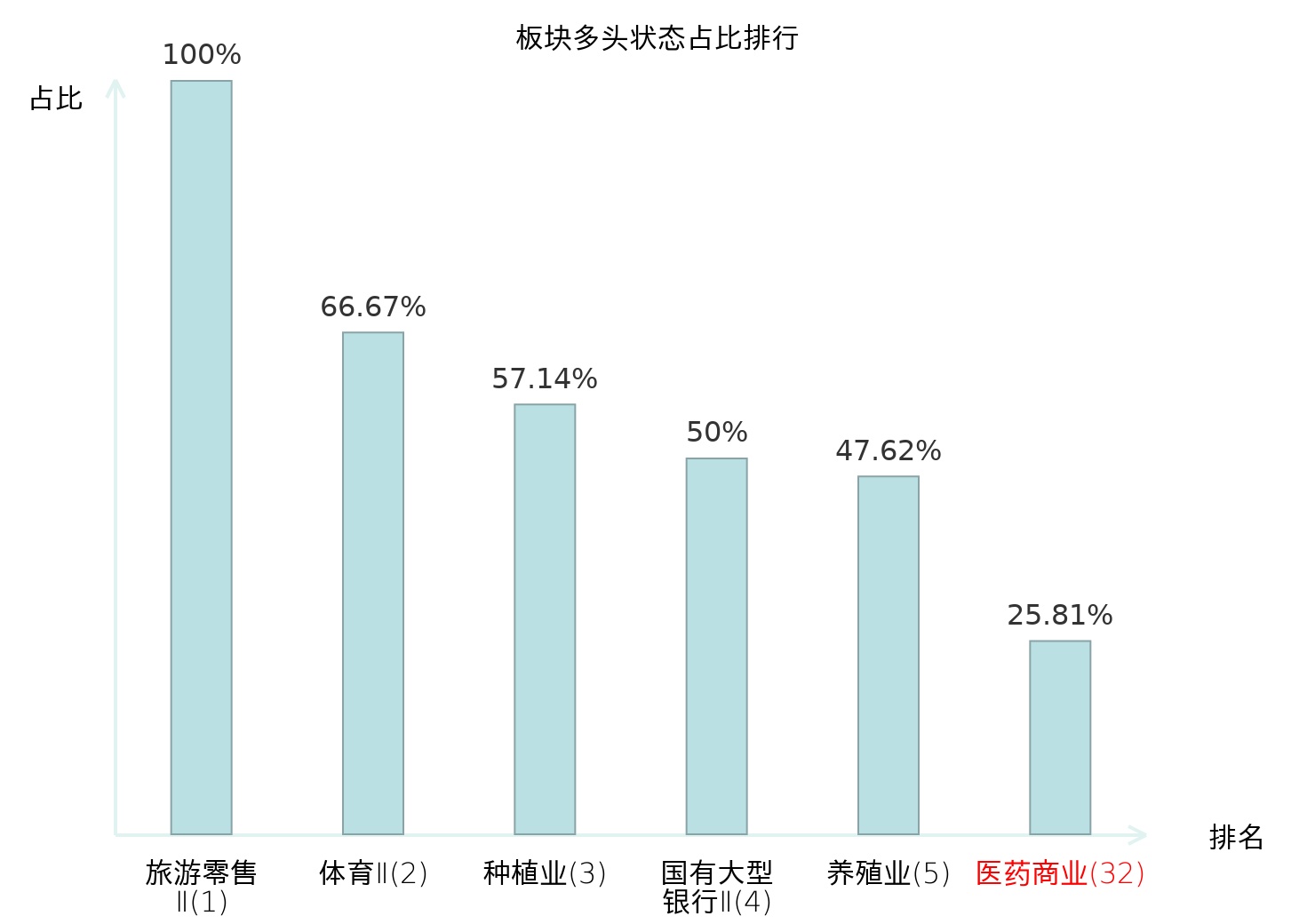 全市场所有行业板块中主力多头状态占比排名中,旅游零售Ⅱ板块位居第一。互联网电商板块名次提升最快,较昨日上升89位。