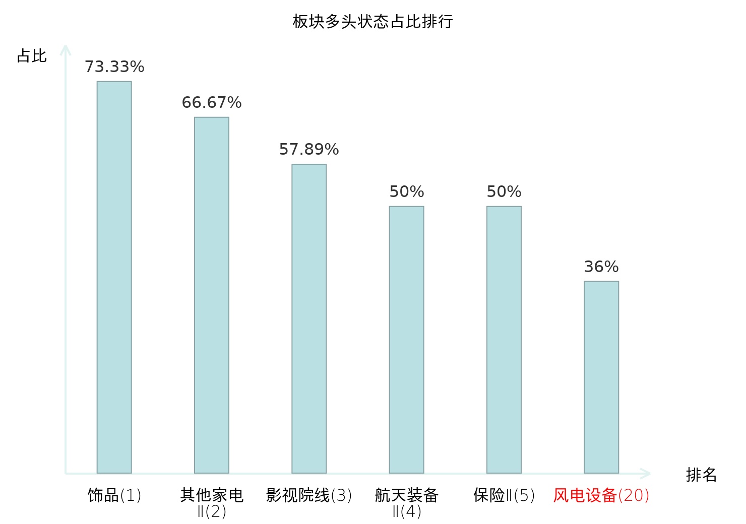 全市场所有行业板块中主力多头状态占比排名中,饰品板块位居第一。航天装备Ⅱ板块名次提升最快,较昨日上升109位。