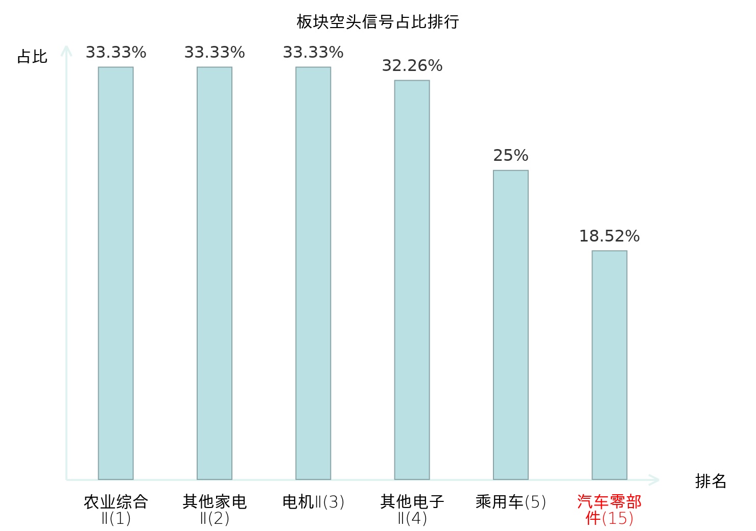 全市场所有行业板块中主力空头信号占比排名中,农业综合Ⅱ板块位居第一。电子化学品Ⅱ板块名次提升最快,较昨日上升116位。