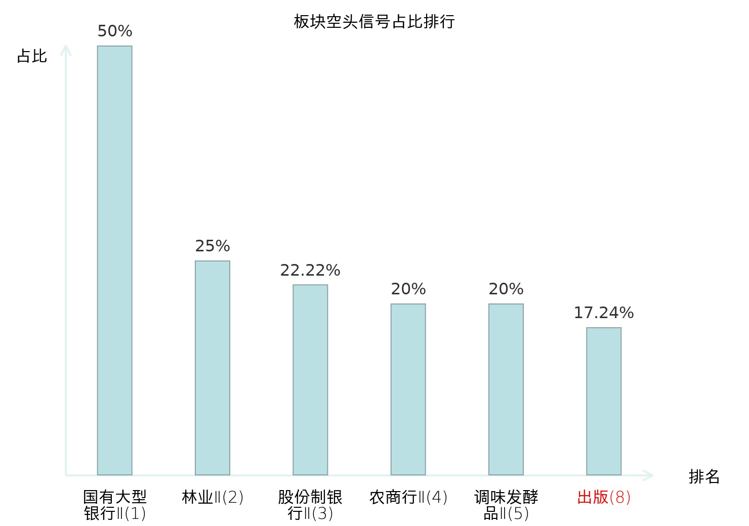 全市场所有行业板块中主力空头信号占比排名中,国有大型银行Ⅱ板块位居第一。电子化学品Ⅱ板块名次提升最快,较昨日上升111位。