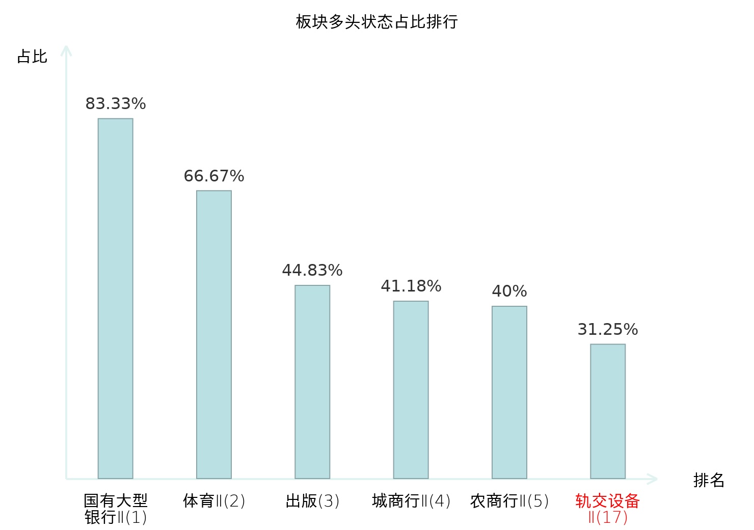 全市场所有行业板块中主力多头状态占比排名中,国有大型银行Ⅱ板块位居第一。焦炭Ⅱ板块名次提升最快,较昨日上升35位。