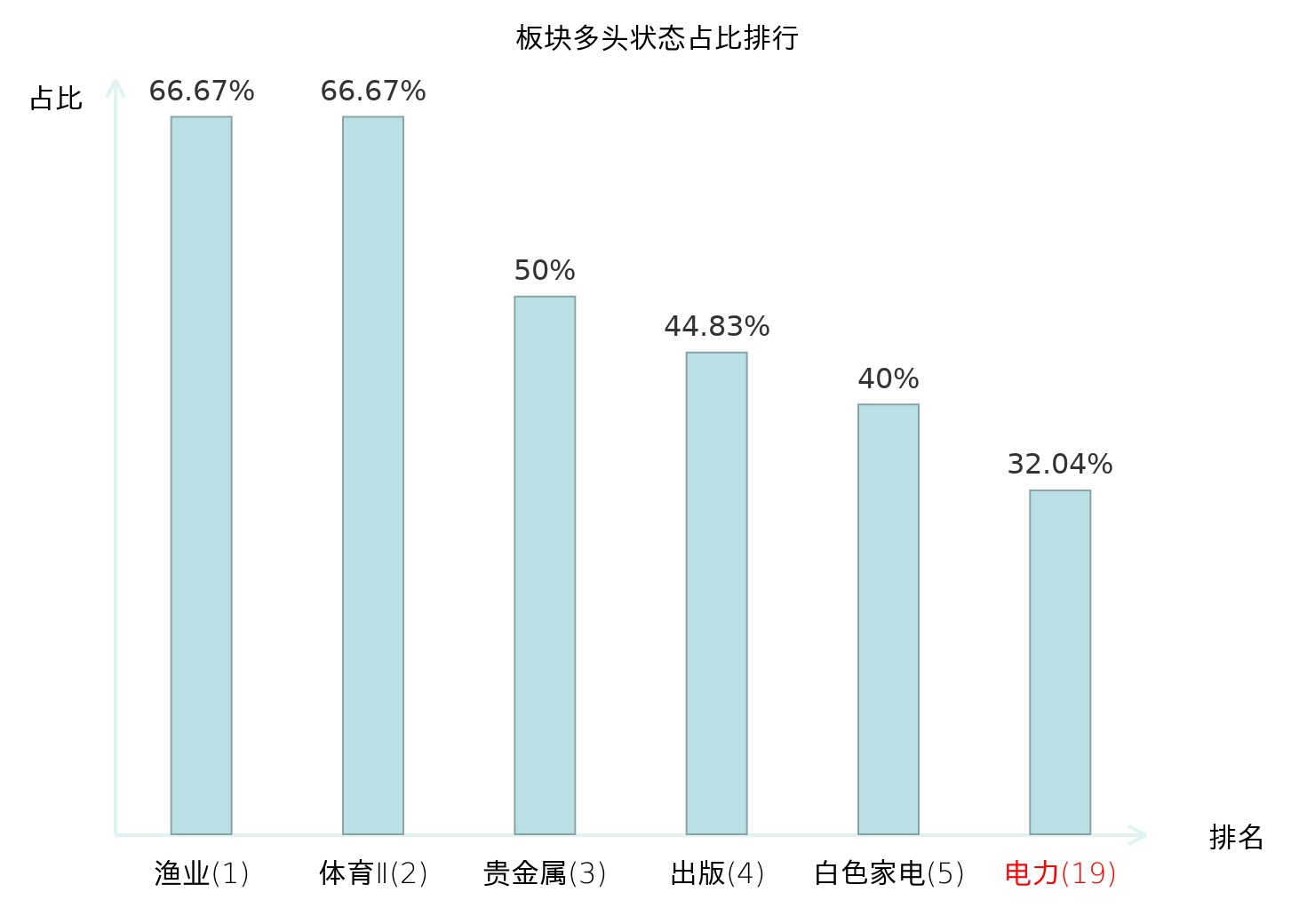 全市场所有行业板块中主力多头状态占比排名中,渔业板块位居第一。出版板块名次提升最快,较昨日上升95位。
