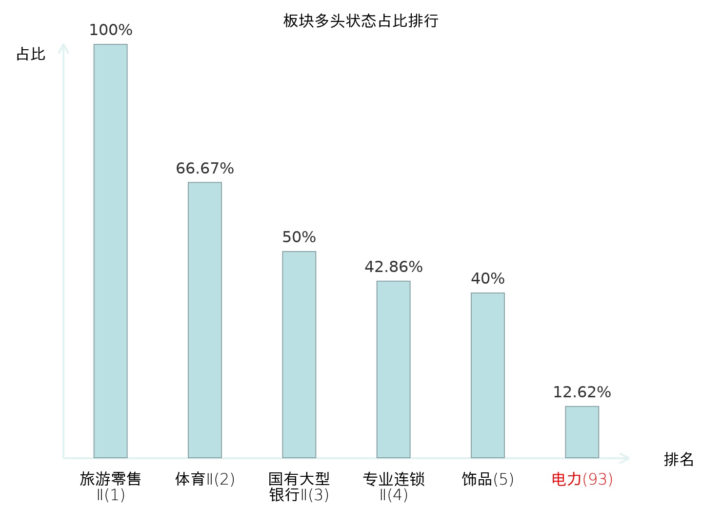 全市场所有行业板块中主力多头状态占比排名中,旅游零售Ⅱ板块位居第一。半导体板块名次提升最快,较昨日上升78位。
