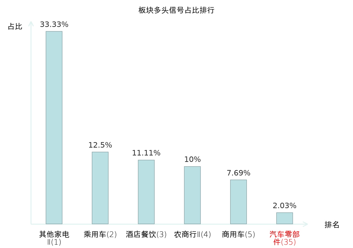 全市场所有行业板块中主力多头信号占比排名中,其他家电Ⅱ板块位居第一。其他家电Ⅱ板块名次提升最快,较昨日上升128位。