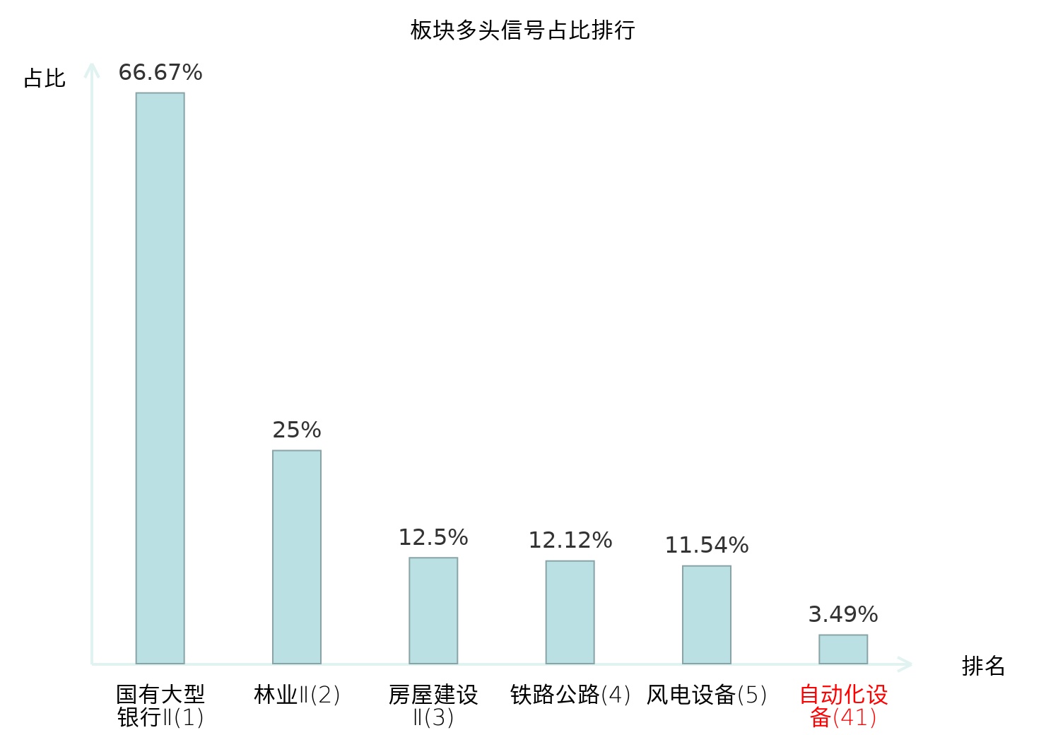 全市场所有行业板块中主力多头信号占比排名中,国有大型银行Ⅱ板块位居第一。林业Ⅱ板块名次提升最快,较昨日上升124位。
