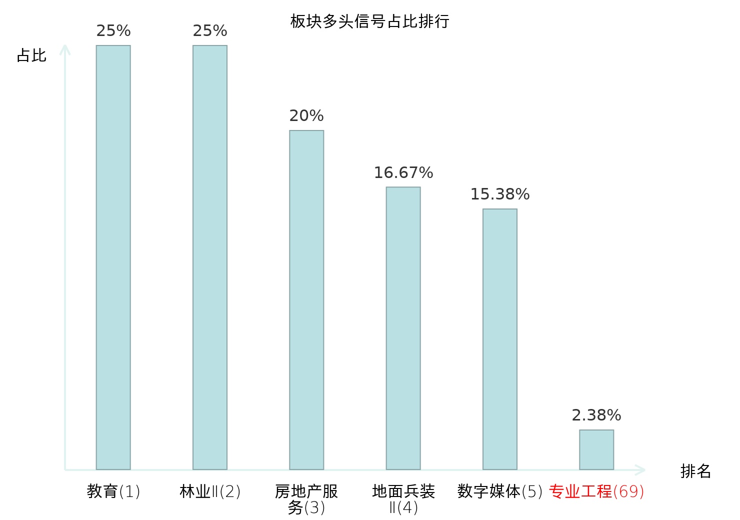 全市场所有行业板块中主力多头信号占比排名中,教育板块位居第一。林业Ⅱ板块名次提升最快,较昨日上升125位。
