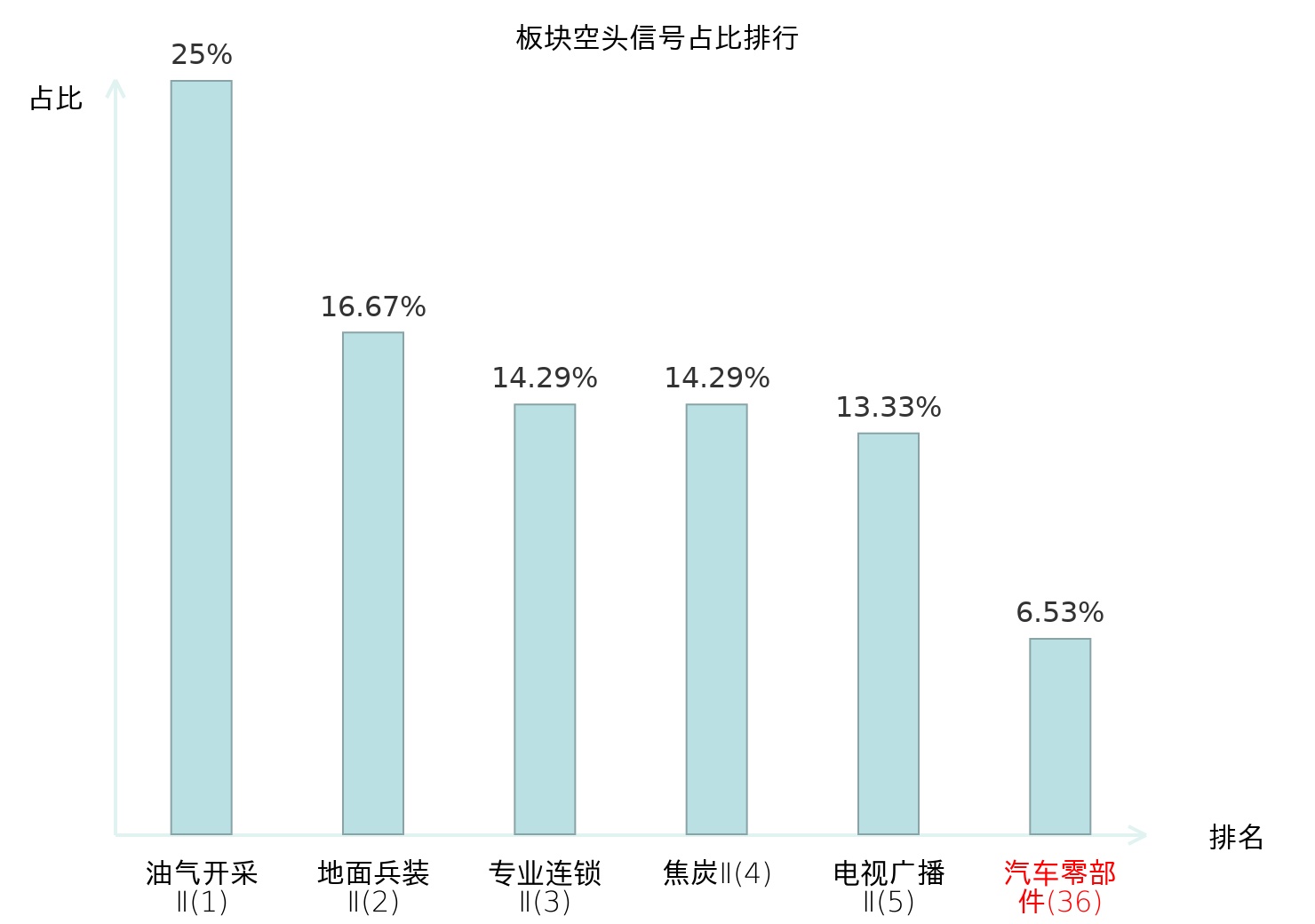 全市场所有行业板块中主力空头信号占比排名中,油气开采Ⅱ板块位居第一。化妆品板块名次提升最快,较昨日上升102位。