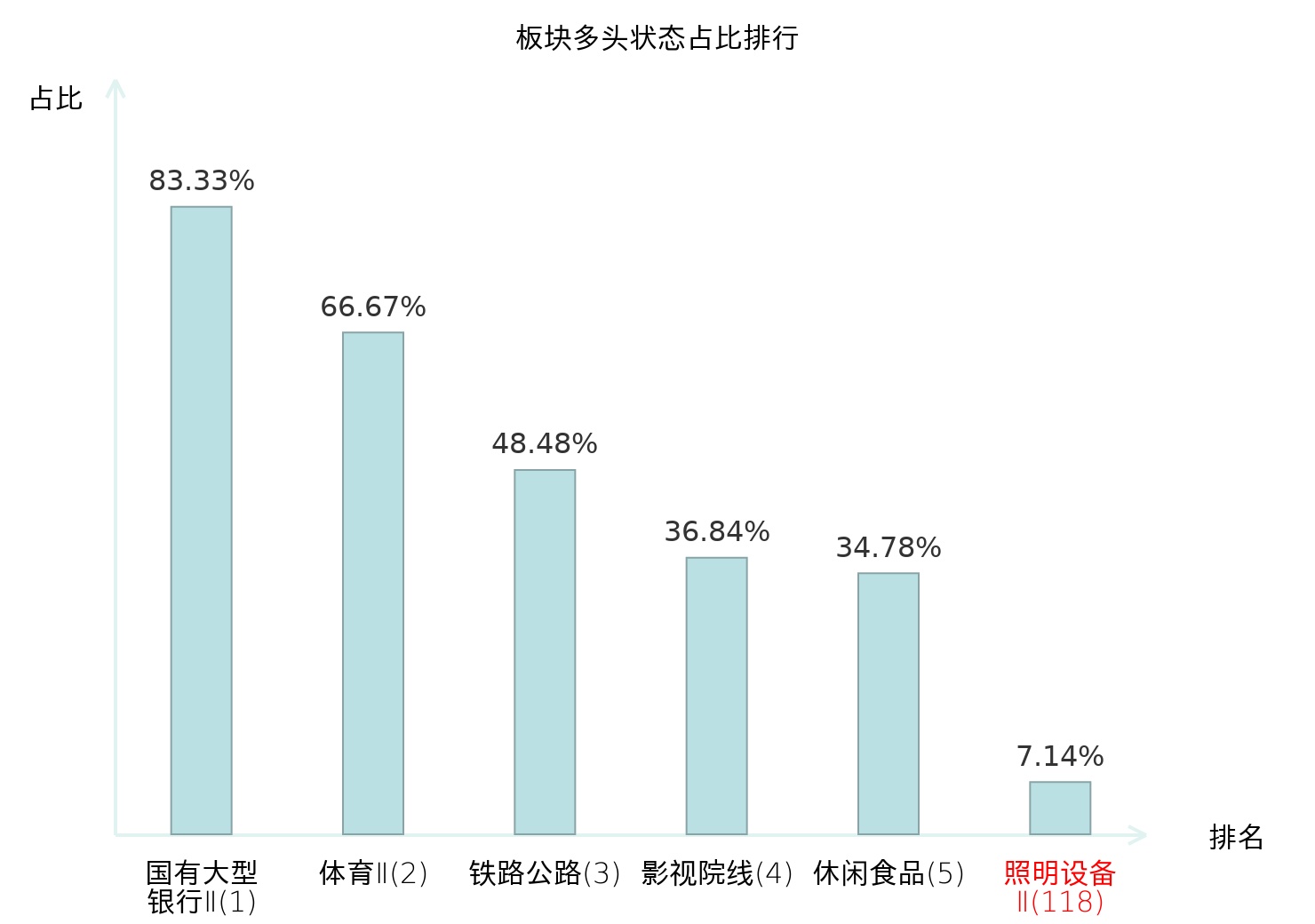 全市场所有行业板块中主力多头状态占比排名中,国有大型银行Ⅱ板块位居第一。个护用品板块名次提升最快,较昨日上升69位。