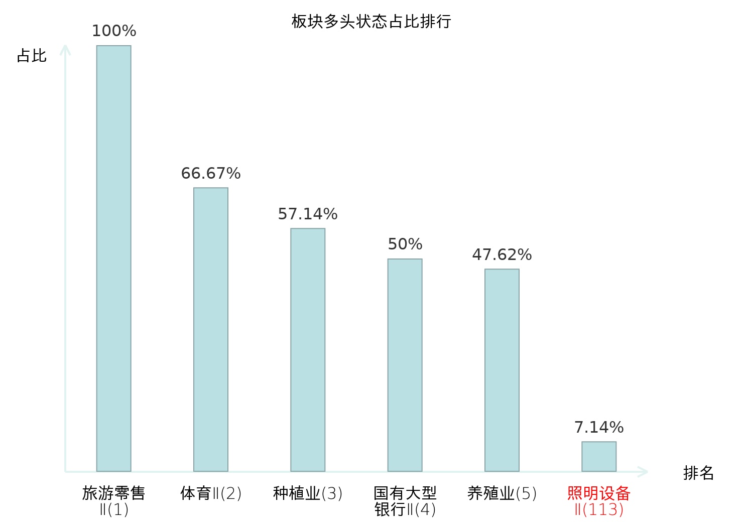 全市场所有行业板块中主力多头状态占比排名中,旅游零售Ⅱ板块位居第一。互联网电商板块名次提升最快,较昨日上升89位。