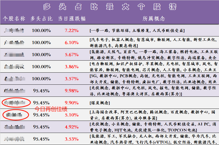 5、虽然整体概念板块表现不佳,【多头占比最大个股】【多头占比上升最大个股】表现较好,昨日提到的煤炭概念、上海国企改革等概念股都再创佳绩!