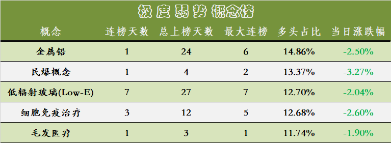 3、今日弱势概念新增金属铅、民爆概念、毛发医疗弱势概念,注意防范!