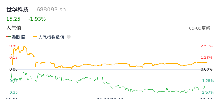 09月09日,世华科技收报15.25,股价涨幅-1.93%,成交金额963.24万,换手率0.25%。