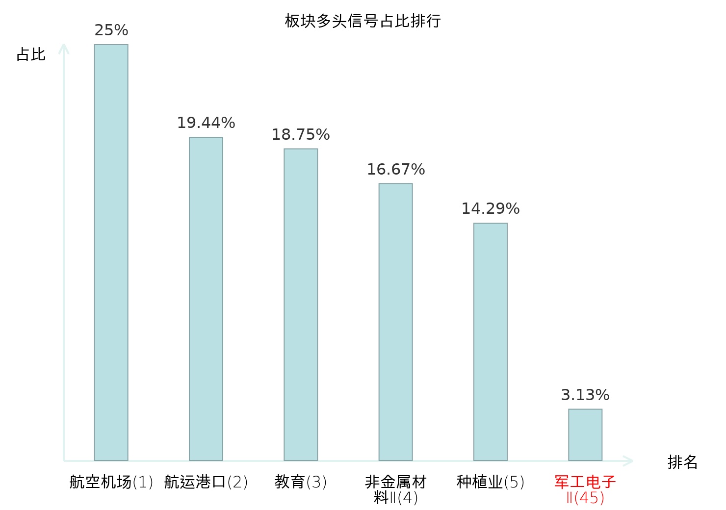 全市场所有行业板块中主力多头信号占比排名中,航空机场板块位居第一。航空机场板块名次提升最快,较昨日上升111位。
