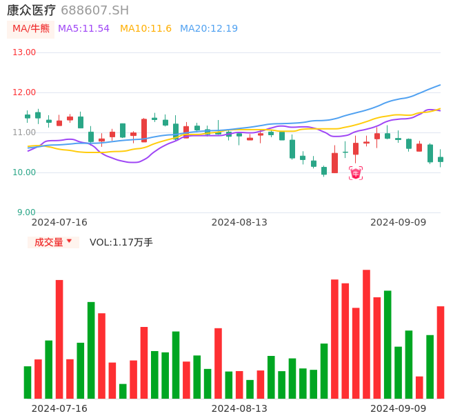 09月09日,康众医疗收报10.27,股价涨幅0.10%,成交金额1213.43万,换手率1.33%。