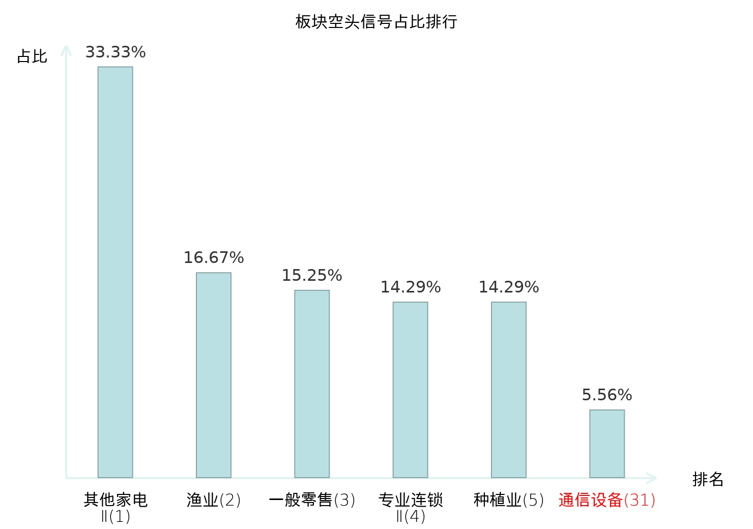 全市场所有行业板块中主力空头信号占比排名中,其他家电Ⅱ板块位居第一。造纸板块名次提升最快,较昨日上升115位。