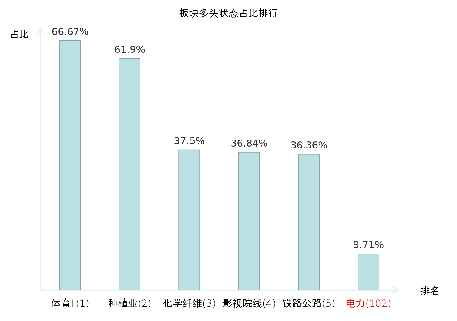 全市场所有行业板块中主力多头状态占比排名中,体育Ⅱ板块位居第一。种植业板块名次提升最快,较昨日上升65位。