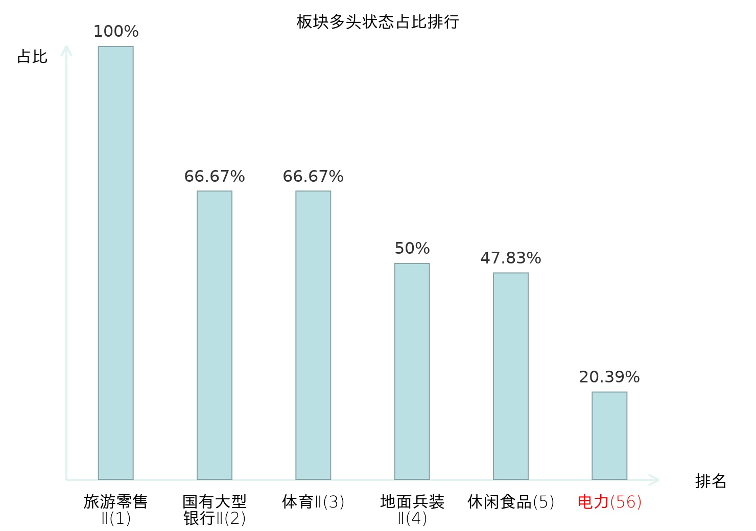 全市场所有行业板块中主力多头状态占比排名中,旅游零售Ⅱ板块位居第一。航空机场板块名次提升最快,较昨日上升80位。