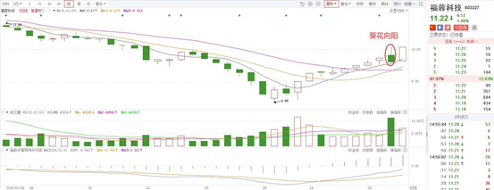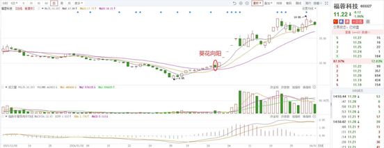 如图所示,福蓉科技的股价经过一波下跌后,从2024年2月6日重新开始上涨且在上涨途中2024年2月28日走出葵花向阳形态,预示股价将继续上涨,之后开启了一波拉升,一个月之内走出翻倍行情。
