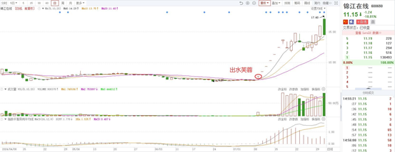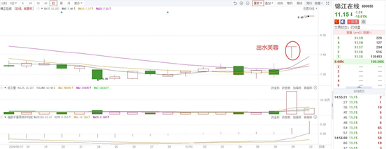 如图所示,锦江在线的股价经过一波盘整后,在2024年7月9日突然发动上涨行情,形成出水芙蓉形态,预示股价将要大涨,之后开启了连板走势,一个月之内走出翻倍行情。