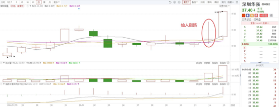 如图所示,深圳华强的股价在2024年8月14日到8月15日期间,走出了一组仙人指路形态,预示股价短期将走强,之后开启了连板走势,一个月之内走出翻倍大行情。