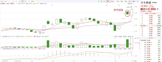 如图所示,万丰奥威的股价在2024年2月8日走出了空中加油形态,说明该股未来走强的可能性较大,随后沿着5日均线重心不断上移,走出趋势大牛股。