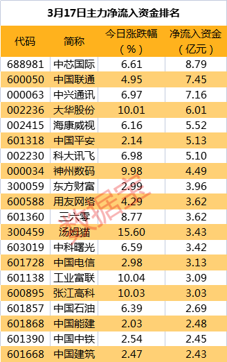 此外,紧随其后是中国联通和中兴通讯,主力资金净流入分别为7.45亿元和7.16亿元。