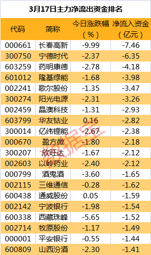 其后,净卖出居前的个股为宁德时代、药明康德、隆基绿能,净流出资金分别为6.35亿元、4.18亿元、3.98亿元。