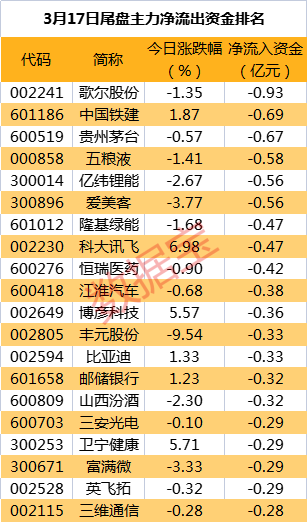 数据宝统计,9股尾盘遭主力出逃超0.4亿元,其中歌尔股份尾盘净流出金额0.93亿元居首。紧随其后是中国铁建、贵州茅台、五粮液,尾盘净流出资金分别为0.69亿元、0.67亿元、0.58亿元。